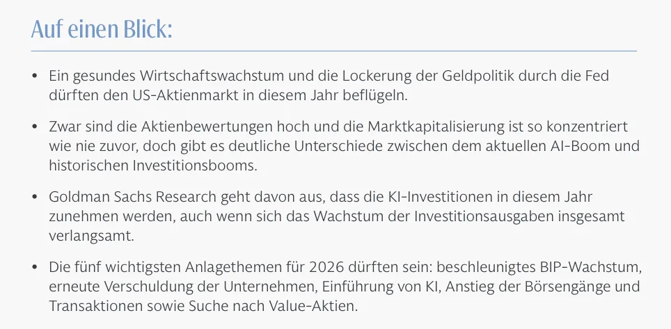 Quelle: Der Beitrag wurde am 9. Januar 2026 unter dem Titel „The S&P 500 Is Expected to Rally 12% This Year“ auf www.goldmansachs.com im Bereich Insights/Articles veröffentlicht. Bitte beachten Sie, dass die darin getroffenen Aussagen keine Anlageempfehlungen darstellen.