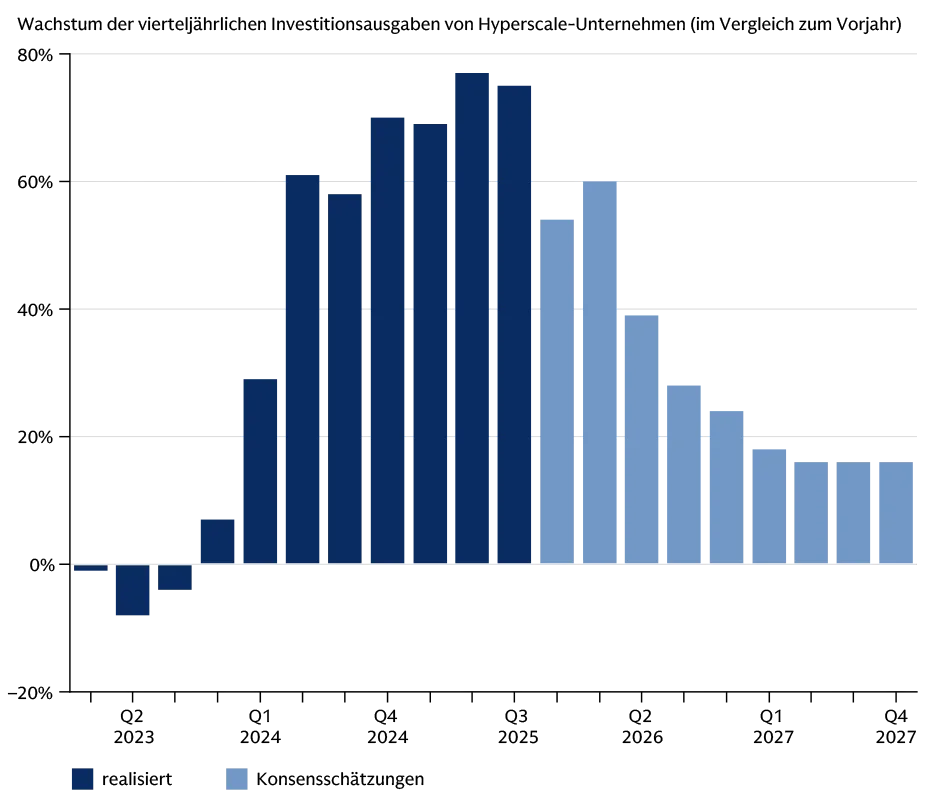 Der Chart zeigt das Wachstum der Investitionsausgaben der größten US-Tech-Unternehmen 2025/2024 im Jahresvergleich. Die Konsensschätzungen ab dem vierten Quartal 2025 bleiben zunächst hoch, dürften sich danach aber abschwächen.