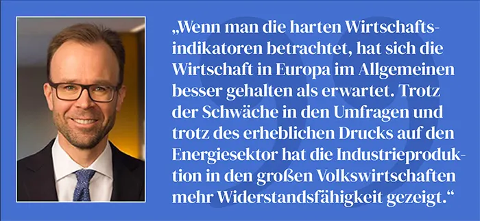 Jan Hatzius: Erstens: Die Wirtschaft hat sich im Allgemeinen besser gehalten als erwartet, zumindest wenn man die harten Wirtschaftsindikatoren betrachtet. Trotz der Schwäche in den Umfragen und trotz des erheblichen Drucks auf den Energiesektor und des starken Rückgangs des Energieverbrauchs hat sich die Industrieproduktion in den großen Volkswirtschaften im Wesentlichen weiter seitwärts entwickelt. Sie hat also etwas mehr Widerstandsfähigkeit gezeigt.