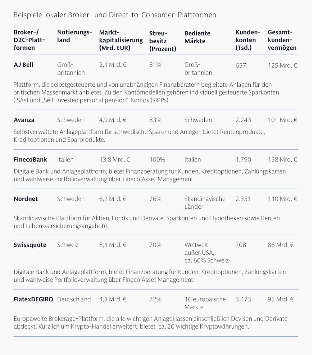 Der europäische Plattformmarkt wird derzeit von „lokalen Champions“ dominiert, die in ihren jeweiligen Heimatmärkten in unterschiedlichen Reifestadien tätig sind. Die Übersicht zeigt eine Auswahl europäischer Brokerage- und Sparplattformen.