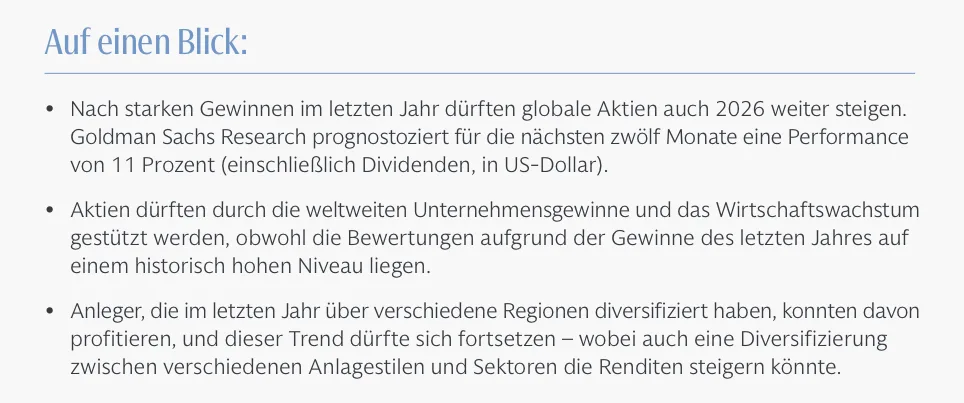 Quelle: Der Beitrag wurde am 8. Januar 2026 unter dem Titel „Global Stocks Are Projected to Return 11% in the Next 12 Months“ auf www.goldmansachs.com im Bereich Insights/Articles veröffentlicht. Bitte beachten Sie, dass die darin getroffenen Aussagen keine Anlageempfehlungen darstellen.
