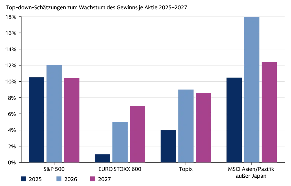 Quelle: Institutional Brokers' Estimate System (I/B/E/S), Toyo Keizai, STOXX, MSCI, Goldman Sachs Research. Daten vom 16. Dezember 2025. Bitte beachten Sie, dass frühere Wertentwicklungen, Simulationen oder Prognosen kein verlässlicher Indikator für die künftige Wertentwicklung sind. Bitte beachten Sie ferner, dass Gewinne von Gebühren und anderen Kosten beeinflusst werden könnten.