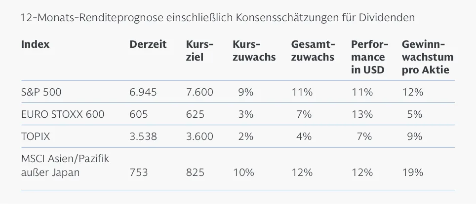 Die 12-Monats-Prognosen der Goldman Sachs Analysten deuten darauf hin, dass die Kurse von Aktien, gewichtet nach regionaler Marktkapitalisierung, um 9 Prozent steigen und eine Rendite von 11 Prozent einschließlich Dividenden erzielen werden (Stand: 6. Januar 2026). „Der Großteil dieser Renditen ist gewinnorientiert“, fügt Oppenheimer hinzu.
