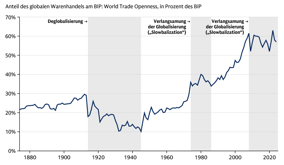 Der weltweite Warenhandel, der seit Mitte der 1980er Jahre bis etwa 2008 kontinuierlich angestiegen war, ist ins Stocken geraten. Seitdem liegt er unter starken Schwankungen bei einem Wert von rund 60 Prozent.