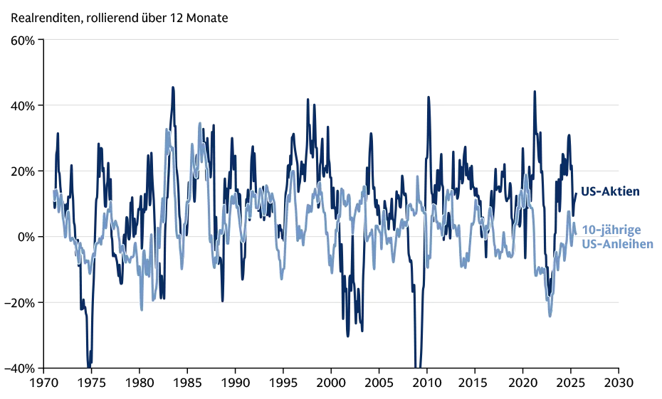 In jedem 12-Monats-Zeitraum, in dem sowohl Aktien als auch Anleihen negative Renditen erzielten, lieferten entweder Rohstoffe oder Gold positive Realrenditen. Der Chart zeigt monatliche Daten zu US-Anleihen und US-Aktien.