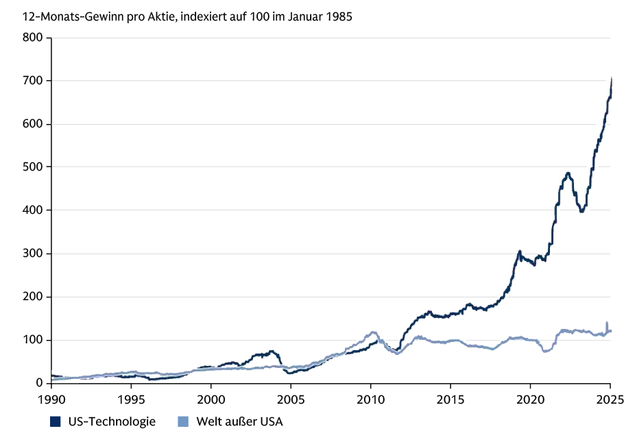 Die Grafik zeigt, dass die Gewinne von Technologieunternehmen deutlich höher waren als die des breiteren globalen Aktienmarktes. Dabei hat die US-Technologiebranche die globalen Märkte übertroffen.