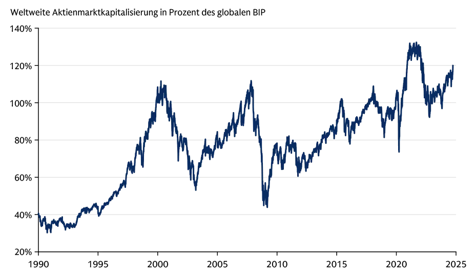 Die globalen Aktienmärkte haben seit dreieinhalb Jahrzehnten mehrere krisenbedingte Baissephasen überwunden. Aktien sind international derzeit historisch hoch bewertet, wobei vor allem US-Aktien an der Spitze stehen.