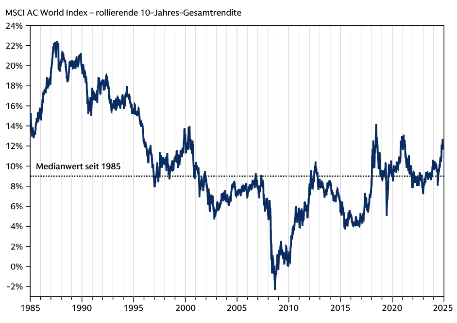 So beträgt die jährliche Rendite seit 2000 ebenfalls 7,7 Prozent, und in der Zeit nach der globalen Finanzkrise waren die durchschnittlichen Renditen niedriger und durch eine hohe Streuung gekennzeichnet – starke technologiegetriebene Performance in den USA, schwächere Renditen in Europa und Japan aufgrund des schleppenden Wachstums und der Deflationsrisiken sowie höhere Volatilität in den Schwellenländern.