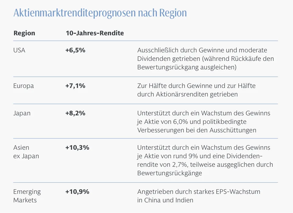 Die langfristige Prognose für globale Aktien basiert auf einem regionenübergreifenden gemeinsamen Rahmen, berücksichtigt jedoch auch lokale Einflussfaktoren. Die vom Modell angegebenen jährlichen Renditen variieren je nach Region.