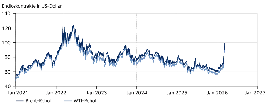 Nach den US-amerikanischen und israelischen Angriffen auf den Iran stieg der Ölpreis sprunghaft an. Was die Energiepreise angeht, wird laut Goldman Sachs Research viel vom Ausmaß und der Dauer der Transitstörungen in der Straße von Hormus abhängen, durch die normalerweise etwa ein Fünftel der weltweiten Öl- und Flüssigerdgasversorgung (LNG) fließt.