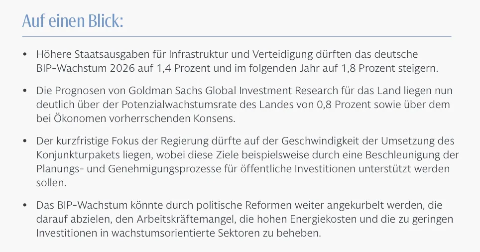 Quelle: Der Beitrag wurde am 8. Oktober 2025 unter dem Titel „Germany’s Economy Is Forecast to Outperform in 2026“ auf www.goldmansachs.com im Bereich Insights/Articles veröffentlicht. Bitte beachten Sie, dass die darin getroffenen Aussagen keine Anlageempfehlungen darstellen.