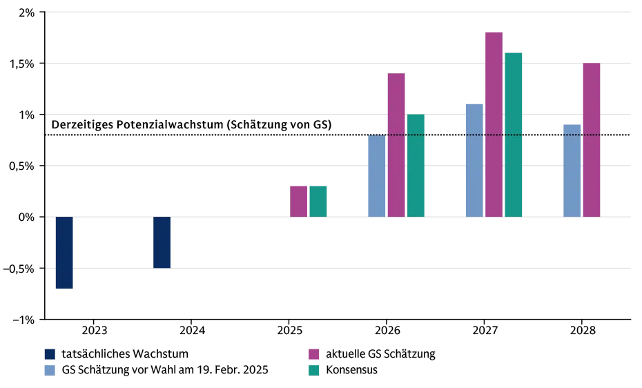 Die Ökonomen von Goldman Sachs erwarten, dass das deutsche BIP-Wachstum von 0,3 Prozent in diesem Jahr auf 1,4 Prozent im Jahr 2026 und 1,8 Prozent im Jahr 2027 steigen wird. Dies liegt deutlich über der potenziellen Wachstumsrate von 0,8 Prozent und dem Konsens der von Bloomberg befragten Ökonomen.