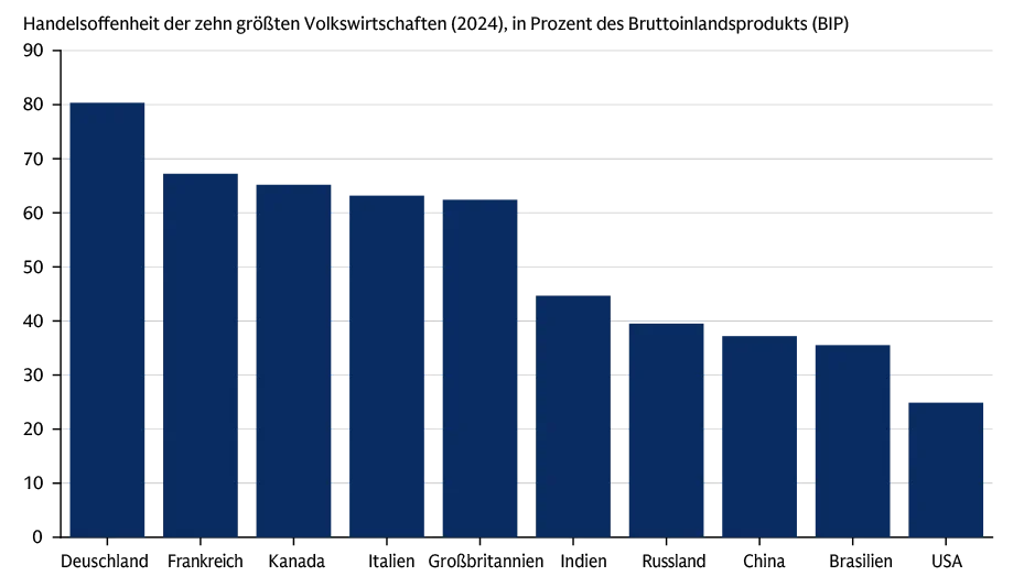 Die Handelsoffenheit entspricht der Außenhandelsquote, also dem Umfang von Importen und Exporten im Vergleich zum Bruttoinlandsprodukt (BIP). Hier führt Deutschland die Rangliste der weltweit zehn größten Länder an.