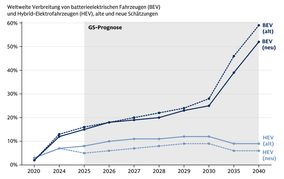 Goldman Sachs Research geht nun davon aus, dass Elektrofahrzeuge im Jahr 2030 einen Anteil von 25 Prozent am weltweiten Absatz haben werden, gegenüber einer früheren Prognose von 28 Prozent. Damit liegt die Prognose für 2030 um 7 Prozentpunkte unter dem aktuellen Marktkonsens für die weltweite Marktdurchdringung von Elektrofahrzeugen, wie er von dem Wirtschaftsprognoseunternehmen IHS Global Insight ermittelt wurde. Das Team senkte gleichzeitig seine Prognose für den Absatzanteil von Elektrofahrzeugen im Jahr 2040 von zuvor 59 Prozent auf 52 Prozent.