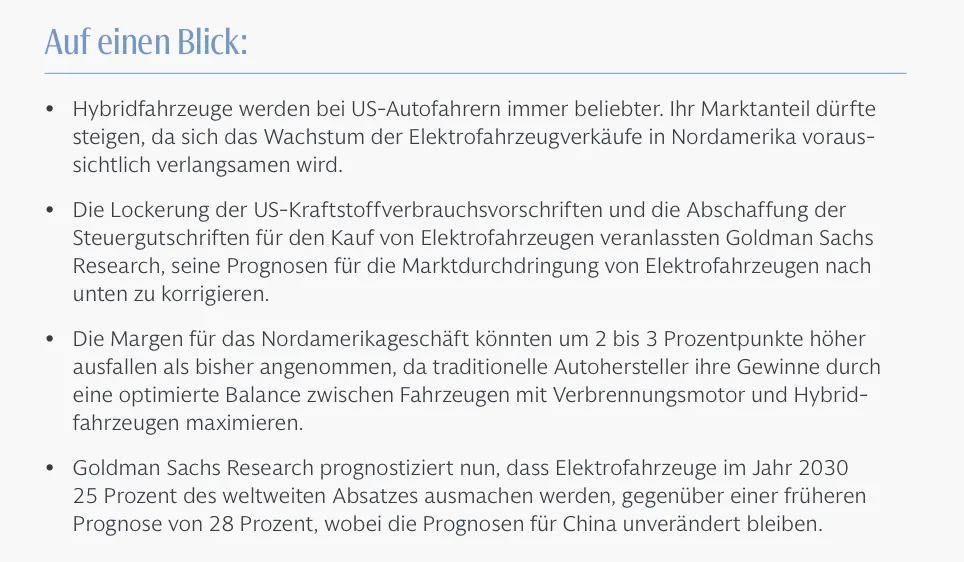 Laut Goldman Sachs Global Investment Research wird sich die Verbreitung von Elektrofahrzeugen (EVs) aufgrund von Änderungen in der Gesetzgebung verlangsamen, wovon Hybridfahrzeuge profitieren dürften. Traditionelle Autohersteller könnten sich daher auf einen deutlichen Gewinnanstieg einstellen.